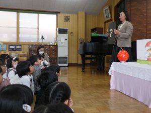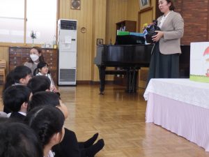 先生が大型絵本『りんごがドスーン🍎』を読んでくれました🎵