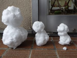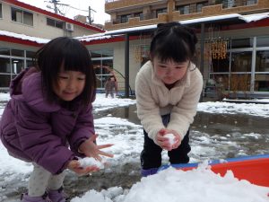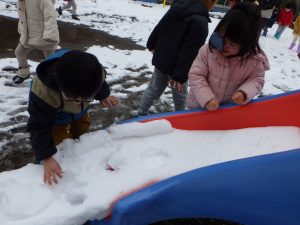 「ゆきがっせんしたい!」「ゆきだるまおおきいのつくりたいね🎵」と雪がもっともっと降り積もることを楽しみにしている子どもたちです😊
