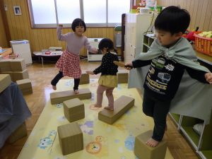 積み木の上で片足立ち!