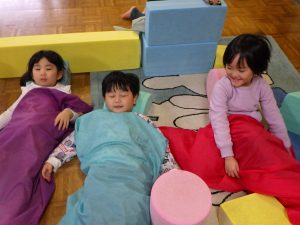お布団をかけて「おやすみなさーい」