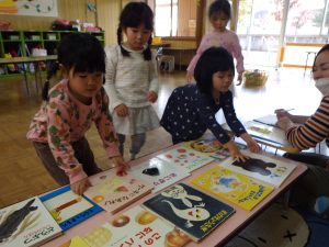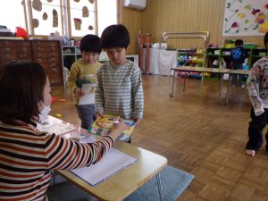読みたい絵本を選んだら、先生にピッとしてもらって自分で絵本バックにしまいますよ。