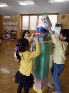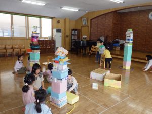 ほし組さんはチームで力を合わせて9マス鬼ごっこをしたり、ドッジボールをしましたよ。みんなで積み上げたタワー、積み木、廃材を使って考えて作ったんだって!さすがほし組さんです✨