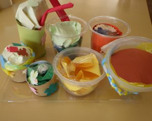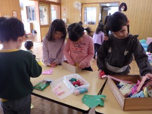箱に貼ったり、「ここは?」と一緒に美味しそうなケーキやジュースを作っていましたよ🍰🍹