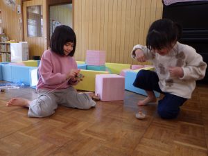 自分より大きいタワーをみんなで押さえていた、たまひよさん🎵