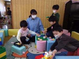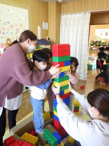 高いタワーがグラグラ!「おっとっと・・・」「おさえて~」と倒れないように…💦