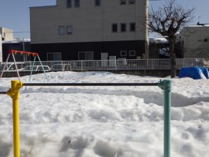 少しずつ雪解けが進み、雪に埋もれていたブランコや鉄棒、ぞうさん滑り台が見えるようになってきました😊