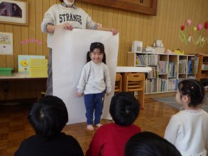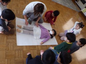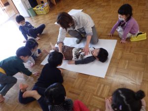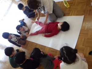 先生が体のまわりを色えんぴつでなぞって…✏