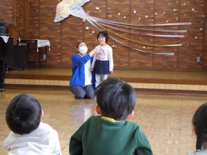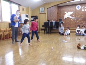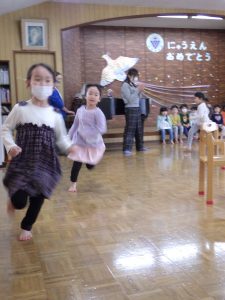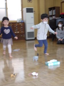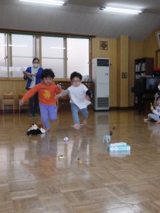 ちゅうりっぷ組、ほし組さんはグループ対抗ゲーム!先生が言った物を探して取りに行くゲームです。ゲットできて喜んだり、泣いて悔しがったり、でも、チームのお友達の頑張りも感じて泣くのをやめて応援していたり・・いろんな様子が見られていましたよ。