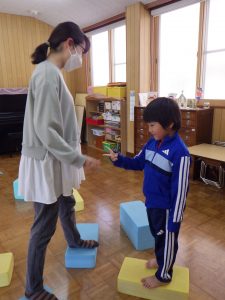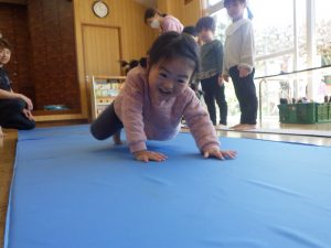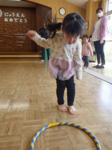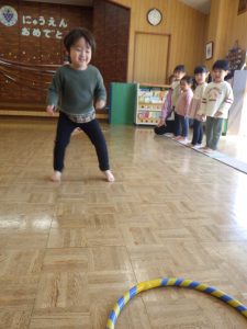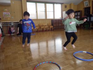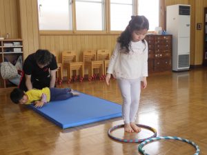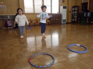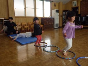 フープからフープまでジャンプをしたり、マットのコロコロ転がってジャンプジャンプ!