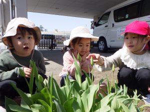 「さーいた~さーいた~ちゅうりっぷのはなが~♪」と膨らんできたちゅうりっぷのつぼみさんを発見!