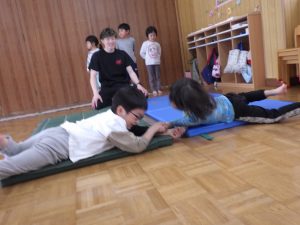 コーチのお話をよく聞いて、頭や口などを押えました。なぜかみんな「お尻!」はとっても早く押えていましたよ😊