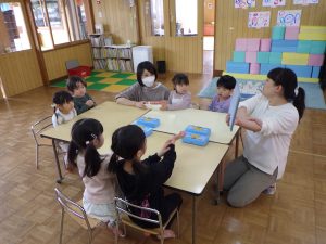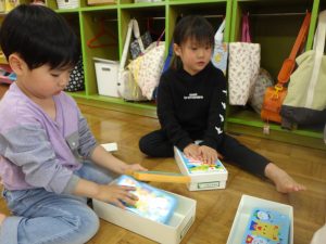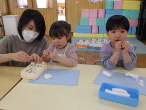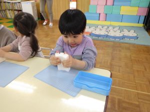 粘土遊び後は、「またね~」「またあそぼうね~✨」と粘土ケースをお道具箱の中にお片付け♪