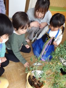 今日は寒かったので、ちょうちょさんはルーの木でじっーとしていましたよ。お天気の日に羽ばたくのかなぁ~?!