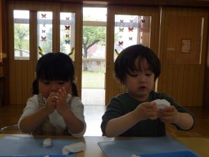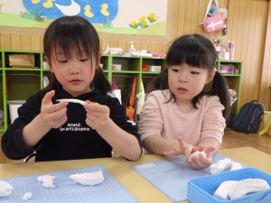 でも何度もコネコネしているうちに「かたくない!」「やわらかい💕」と感触の変化も楽しんでいました。