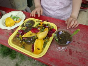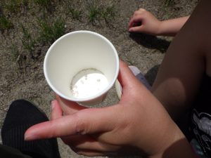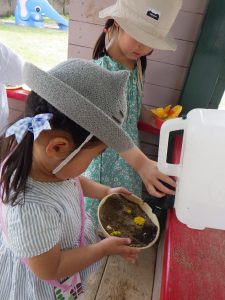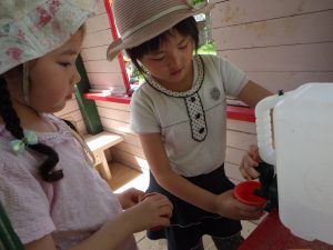 チョロチョロチョロ…コップに注いだり、砂のお料理に混ぜたり…。