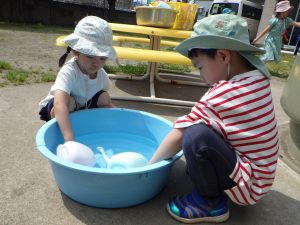 チョロチョロチョロ…コップに注いだり、砂のお料理に混ぜたり…。