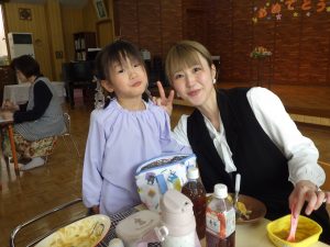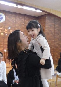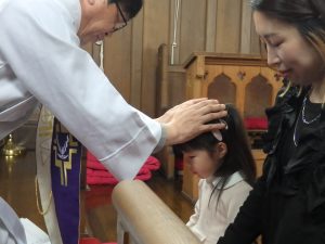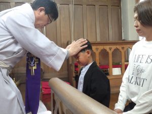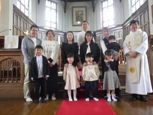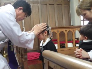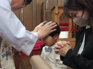 司祭様に祝福していただいているカッコイイお兄さんの姿を見て、おひさま組さんも1人ずつお家の方と一緒に祝福しいただきましたよ✨
