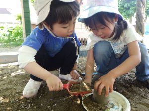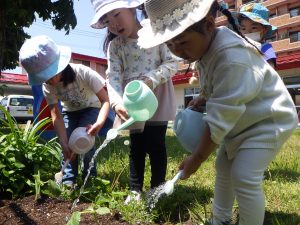 おひさま組さんが植えた苗。「おおきくなぁ~れ!」と水やり🎶