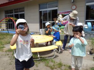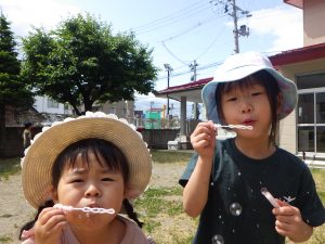 しゃぼん玉をふーっと吹くと風に乗って高ーくとんでいくのが面白くて、