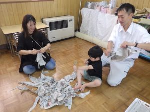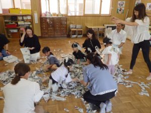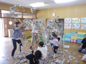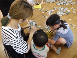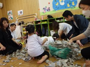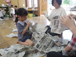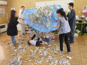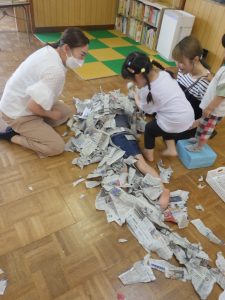 新聞を集めて、集めて~。「3、2、1・・・」で投げたり、ブルーシートにも集めて~!