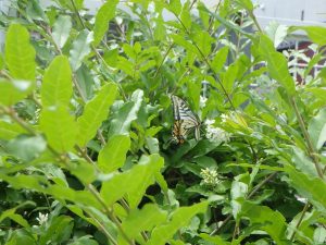 「あぁ!なにかいる!」と葉っぱの陰に何かがぁ…そっと近づいて見てみると、アゲハチョウさんでした