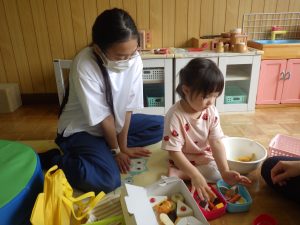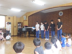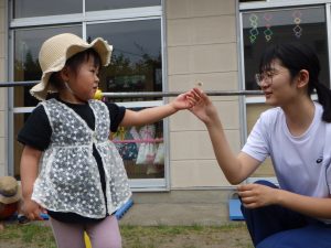 今日は中学生のお兄さんお姉さんが保育体験にやってきて、幼稚園のみんなと一日を過ごしましたよ。