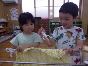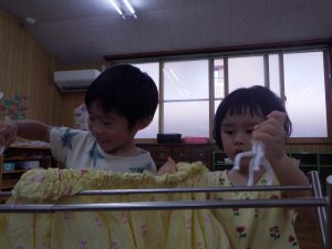 ちゅうりっぷ組さんがなにかを物干しにかけています👀