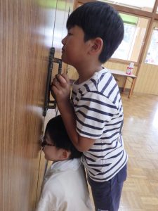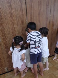 ホールで何してるのかな~?とちゅうりっぷさんのお部屋の隙間からじーっとのぞいて👀