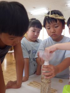 わりばしに1本ずつ稲をはさんで、