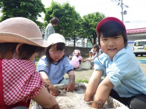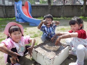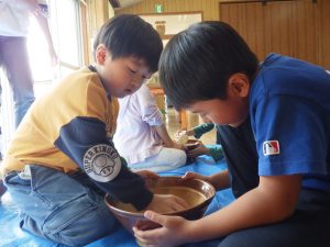 土と水を手を使ってよく混ぜました