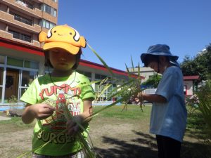 「脱穀」ペットボトルの中に稲を入れて割りばしで挟み引っ張ると…
