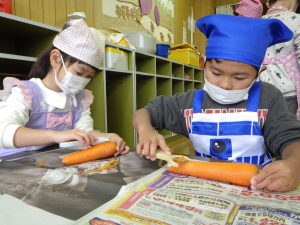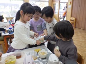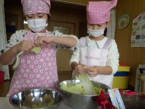 白菜やお豆腐は手でちぎって食べやすい大きさにしました。ナイフでなくてもお料理できたね