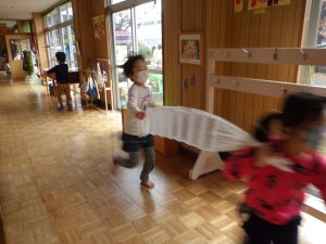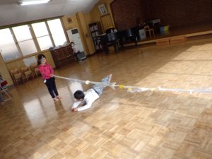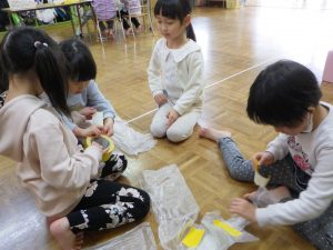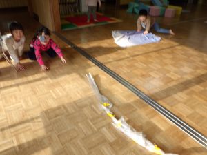 長~い緩衝材を手に竜に変身させて泳がせたり、