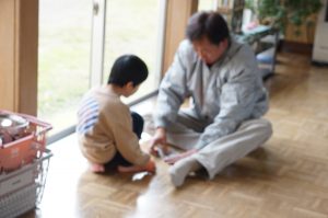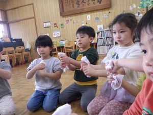 運転手さんが紙鉄砲の作り方を教えてくれていました。