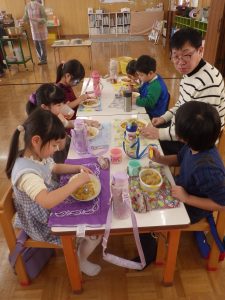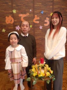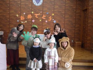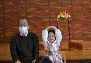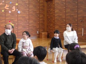 1月生まれのお友達、先生、そして創立記念日を迎えた幼稚園の分、ろうそくをフ~