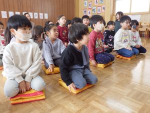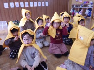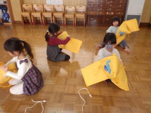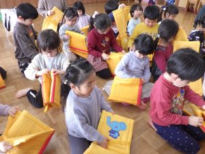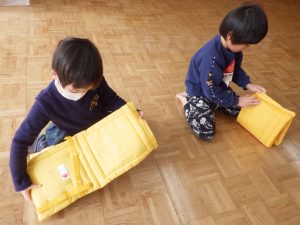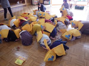 今日の避難訓練は防災ずきんの使い方についてでした。