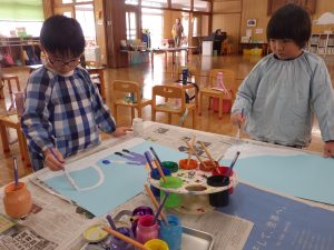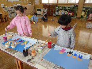 クラスでは雪遊びの絵を描いていました。