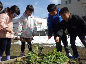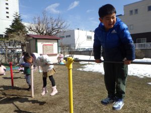 雪が消えて鉄棒ができるようになったね。