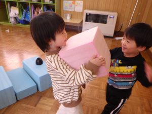 積み木で遊んでいたお友達を見て、一緒にまねっこ😊ハイ!ハイ!とどんどん運んで・・・