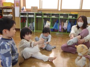 おひさまさんは、靴下ってどうやって履いたらいいのかな?かかとに合わせて履けるかな?