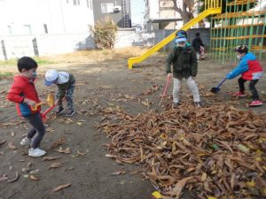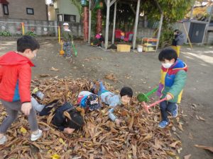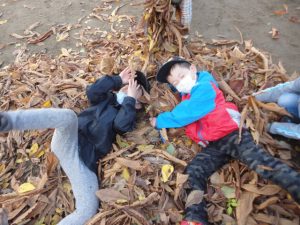 みんなでたくさんの落ち葉を集めて落ち葉のお布団!!