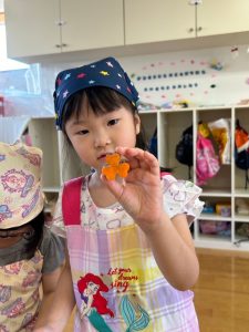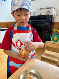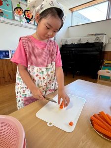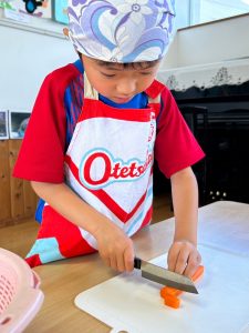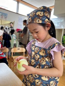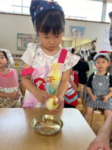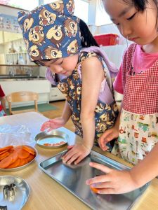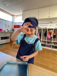 「お泊まり保育の準備をしよう!!」ということで、エプロンをつけて三角巾をつけて準備はOK!!