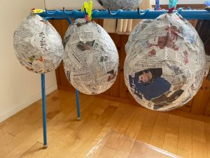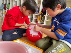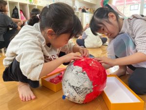 破いた紙や新聞紙を風船にペタペタと貼っていきます
