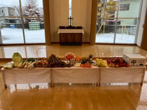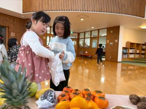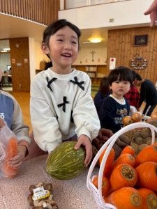 お家から、神様に捧げる野菜・果物を持ってきてくれました。